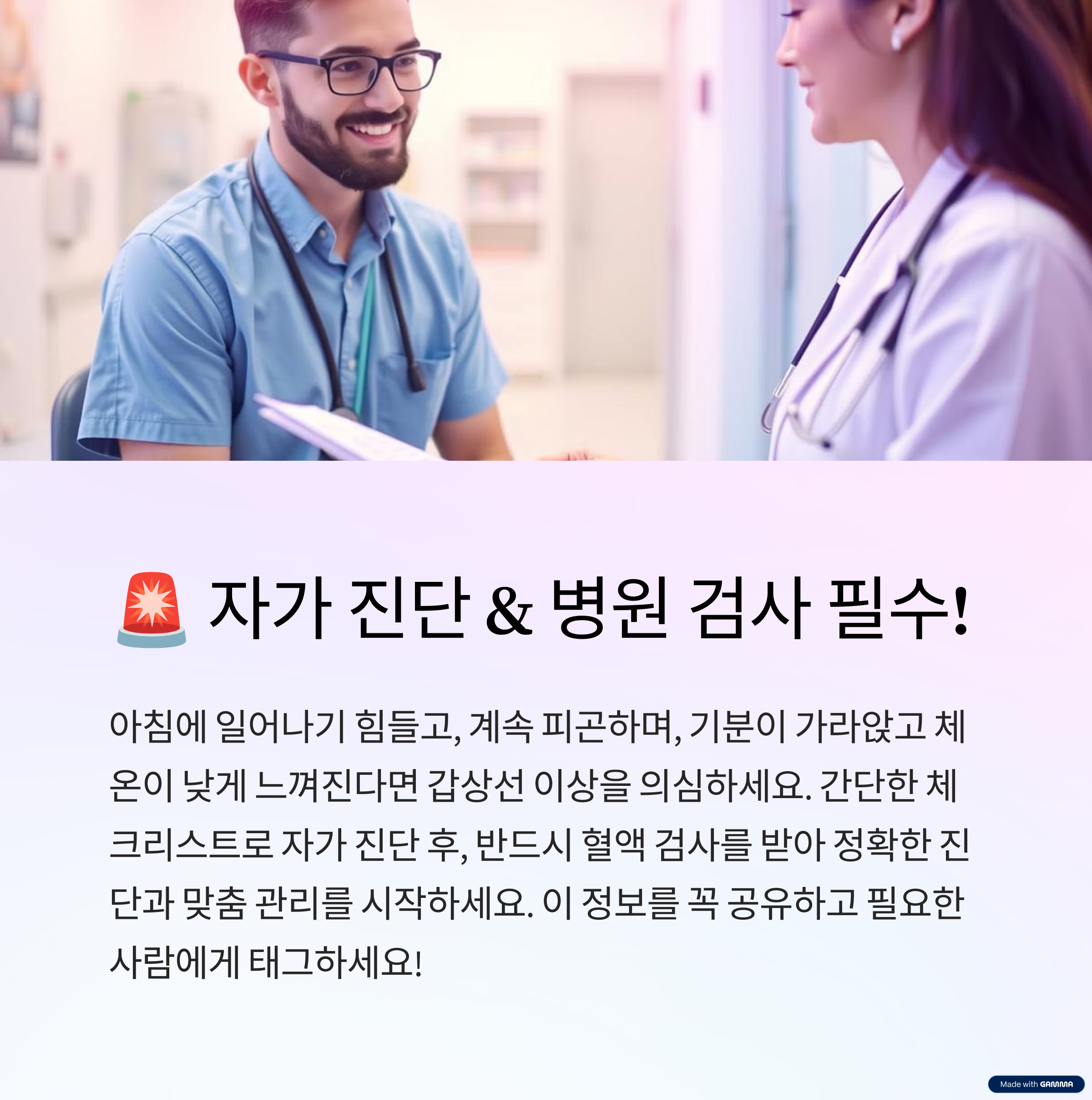 갑상선 이상은 단순한 피로로 오해받기 쉽지만, 조기 인지와 꾸준한 관리가 필요한 건강 경고입니다. 작은 증상 하나하나를 소중히 여기는 것이 건강을 지키는 첫걸음입니다.
